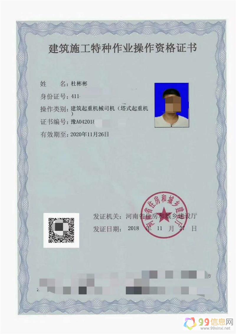 塔吊操作、施工电梯操作、信号指挥工、司索工、物料机操作与安拆、电工、电焊工等特种作业人员培训考证班!详情咨询河南比利文教育辉老师,郑重承诺:在我处培训办理的任何证书,均可在相关机关网站查询真伪,全国通用!9.9.信.息.网