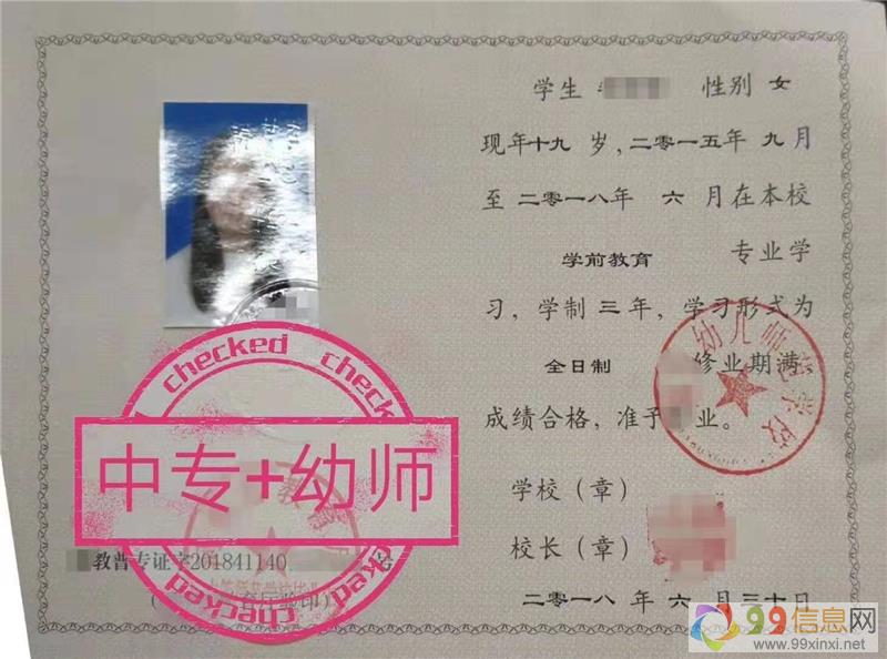 幼师双证:中专幼师专业毕业证+幼师教师资格证原文www.99xinxi.net