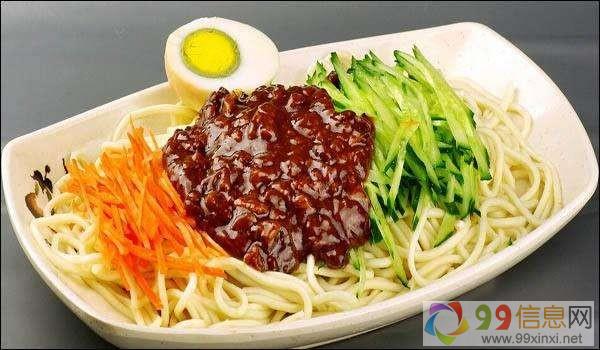 炸酱面是中国传统特色面食99信息网www.99xinxi.net。最初起源北京,属山东鲁菜。不过在传遍大江南北之后便被誉为“中国十大面条”之一 ,流行于北京 、天津、山东、河北、辽宁、吉林等北方地区,由菜码、炸酱拌面条而成。将黄瓜、香椿、豆芽、青豆、黄豆切好或煮好,做成菜码备用。然后做炸酱,将肉丁及葱姜等放在油里炒,再加入黄豆制作的黄酱或甜面酱炸炒,即成炸酱。面条煮熟后,捞出,浇上炸酱,拌以菜码,即成炸酱面HrZ。也可根据自己的口味加辣椒、醋等调味品。这样会更加符合自己的口味。也有面条捞出后用凉水浸洗再加炸酱、菜码的,称 “过水面”。