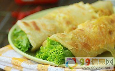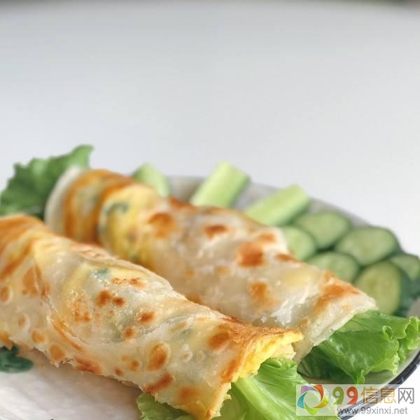 鸡蛋灌饼是用鸡蛋、面粉制作的一道小吃,它是源于河南信阳的特色传统名点,深受当地居民喜爱9_9_信_息_网。把鸡蛋液灌进烙至半熟的饼内,继续煎烙后烤制而成,饼皮酥脆蛋鲜香。鸡蛋灌饼也算一种早餐,有蛋有面有青菜有营养又方便很受大家欢迎,是河南地区的特色小吃之一。